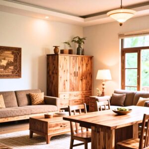 Furniture kayu untuk ruang tamu biasanya mencakup set kursi tamu, meja kopi, rak TV, dan lemari display. Material kayu jati atau mahoni sering dipilih karena memberikan kesan mewah dan formal yang cocok untuk area penerimaan tamu.