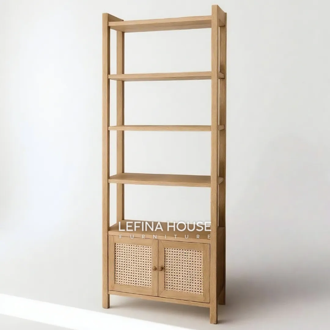 Model dua fungsi ini tidak hanya mempercantik ruangan tetapi juga memberikan kemudahan organisasi. Rak atas terbuka memudahkan Anda menampilkan buku, tanaman kecil, atau dekorasi favorit. Sementara itu, bagian bawah tertutup dengan pintu rotan menjaga barang tetap rapi dan terlindungi dari debu.