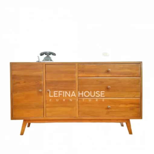 Dengan ukuran 140cm (panjang) x 45cm (lebar) x 60cm (tinggi), bufet ini memiliki proporsi yang pas untuk berbagai jenis ruangan. Dilengkapi dengan 3 laci di bagian tengah yang dapat digunakan untuk menyimpan barang-barang kecil, serta 1 pintu samping untuk penyimpanan barang berukuran sedang hingga besar.