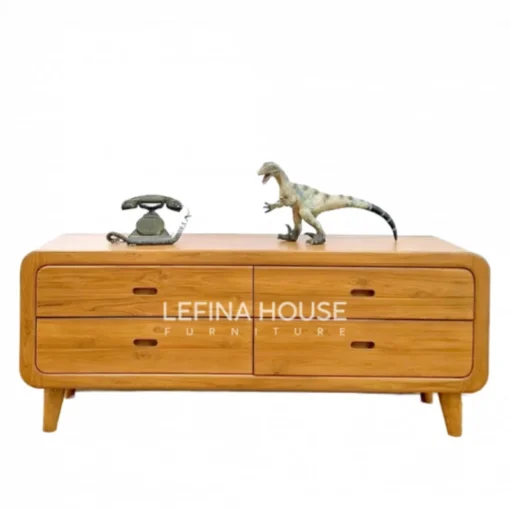 Bufet ini memiliki dimensi 120cm (panjang) x 40cm (lebar) x 50cm (tinggi) — ideal untuk diletakkan di ruang tamu sebagai rak TV atau console table. Dilengkapi 4 laci tertutup yang memberikan ruang penyimpanan aman dan tersembunyi untuk menyimpan perangkat elektronik, dokumen, remote control, hingga barang pribadi lainnya.