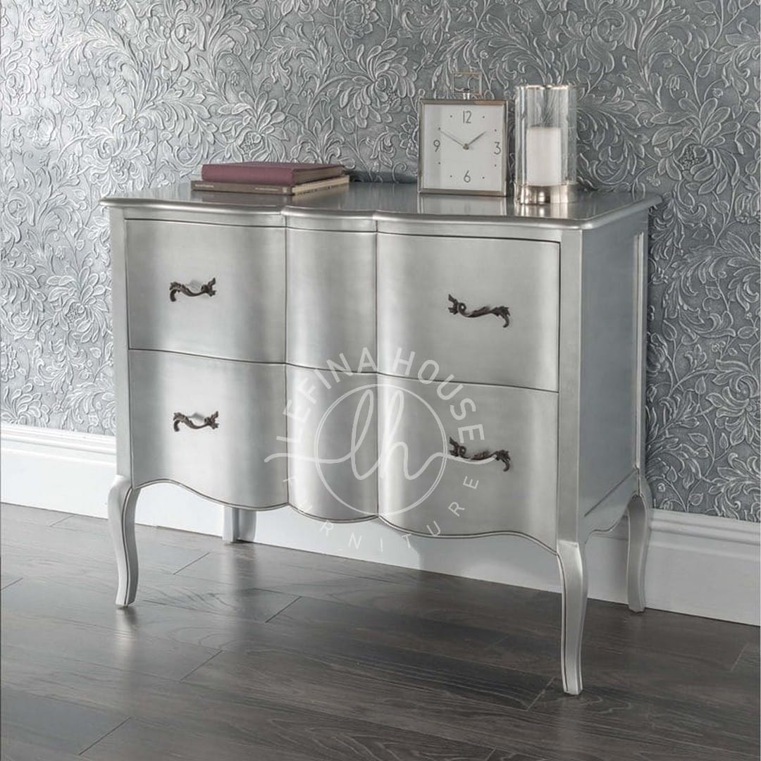 Bufet Silver Klasik Mewah 4 Laci adalah pilihan istimewa bagi Anda yang menginginkan sentuhan kemewahan sekaligus fungsionalitas dalam satu produk. Dibuat dari kayu mahoni berkualitas tinggi, bufet ini hadir dengan finishing silver leaf yang mengkilap, menghadirkan nuansa elegan dalam setiap detailnya. Desain bombe yang klasik menambah nilai estetika dan menghadirkan karakter berbeda di dalam ruangan.