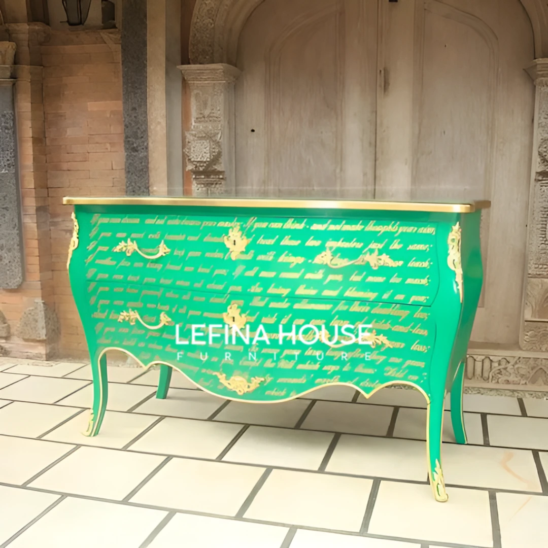 Bufet ini dilengkapi dengan laci penyimpanan yang cukup luas, memungkinkan Anda untuk menyimpan perangkat elektronik atau barang-barang dekoratif lainnya dengan mudah. Desain commode yang klasik, dipadukan dengan warna hijau duco yang lembut, memberikan kesan elegan dan sophisticated. Terbuat dari material kayu solid berkualitas, bufet ini sangat kokoh dan tahan lama.