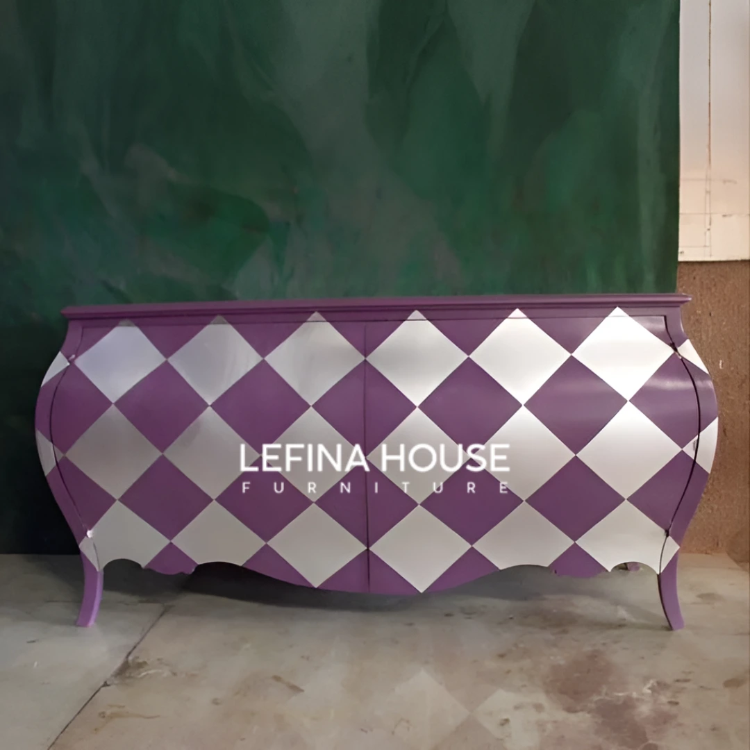 Bufet ini dirancang dengan dua pintu yang luas dan ruang penyimpanan yang sangat praktis untuk menyimpan perangkat elektronik, DVD, dan barang-barang lainnya. Dengan finishing putih dan ungu serta motif catur di permukaannya, bufet ini memberi kesan antik dan mewah, namun tetap praktis untuk penggunaan sehari-hari. Pengerjaan yang rapi dan material kayu solid menjamin kualitas serta ketahanan produk ini.