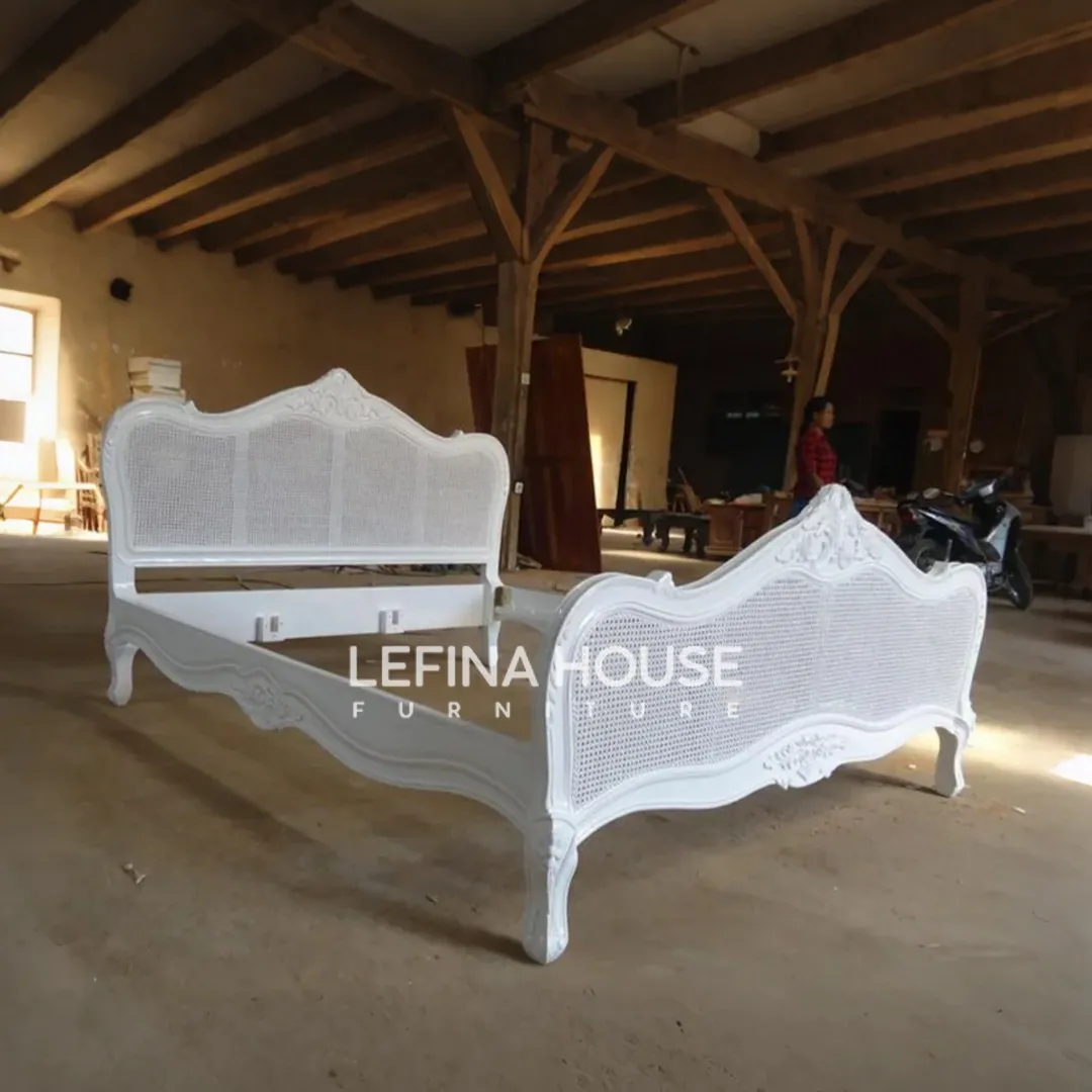 Struktur utama dipan terbuat dari kayu mahoni oven, yang memiliki daya tahan tinggi dan hasil finishing yang halus. Panel sandaran menggunakan rotan anyam alami untuk menghadirkan tekstur dan nuansa tropis yang menyatu harmonis dengan gaya shabby chic.