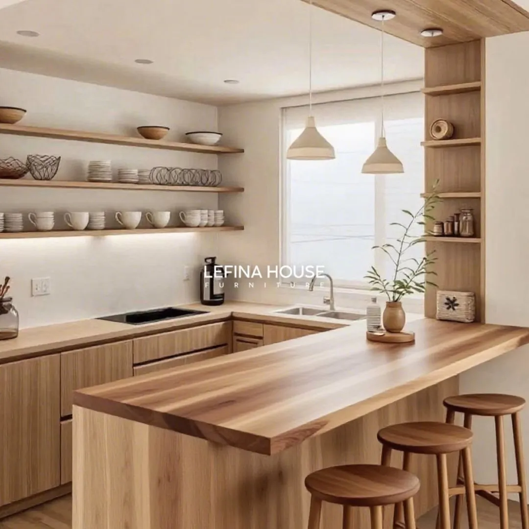 Dengan desain Scandinavian minimalis, Kitchen Set Mini Bar Dapur Kecil Mini Kitchen memadukan fungsionalitas dan estetika dengan sempurna. Open shelving memberikan akses mudah ke peralatan dapur, sementara mini bar memungkinkan Anda menikmati makanan atau minuman dengan nyaman tanpa menghabiskan banyak ruang. Material kayujati yang digunakan memberikan ketahanan dan daya tahan jangka panjang.