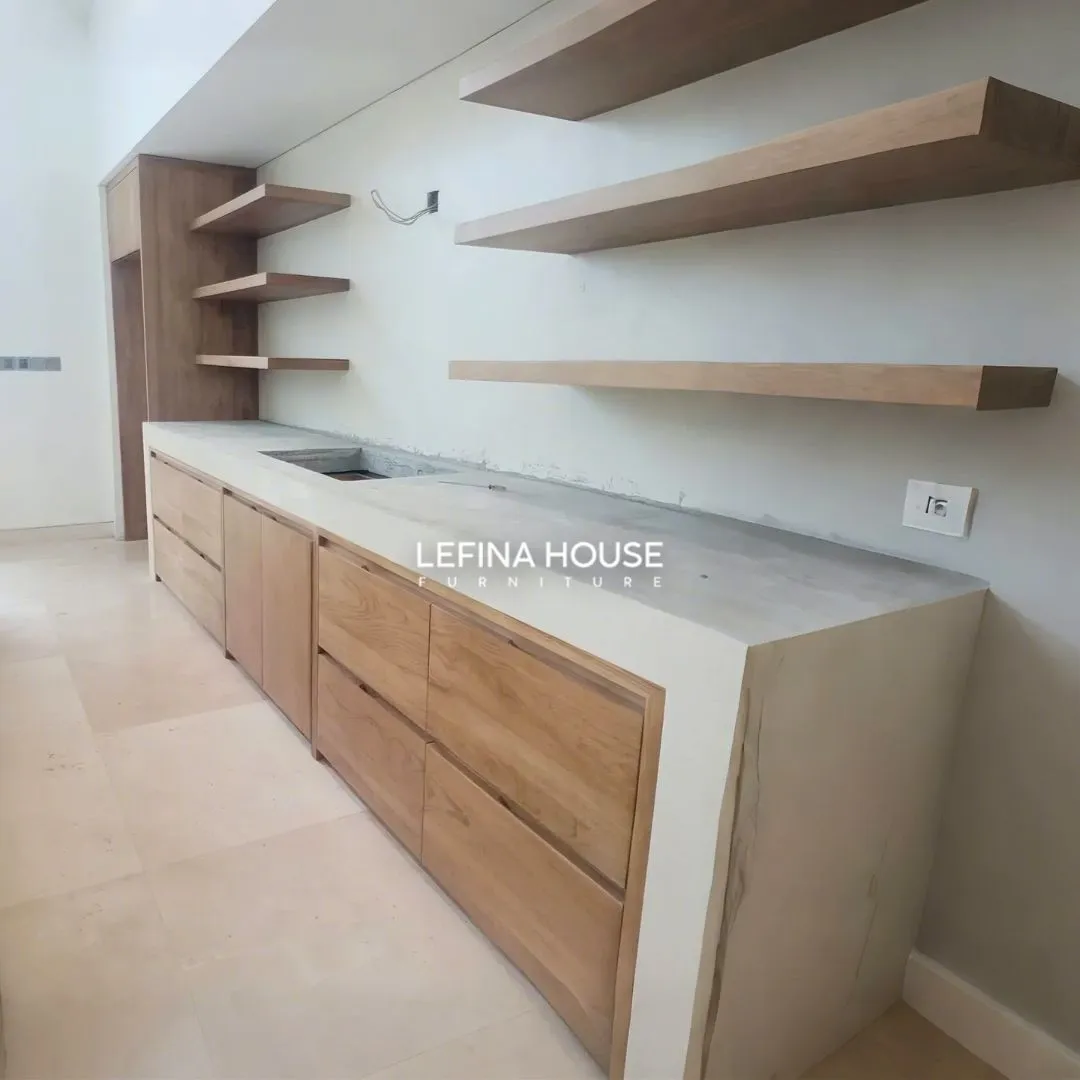 Dengan desain yang praktis dan efisien, Kitchen Set Minimalis Dapur Kecil Dapur Murah memberikan kombinasi antara fungsionalitas dan estetika. Kabinet bawah dan open shelf memberikan Anda tempat penyimpanan yang rapi dan mudah diakses, sementara material kayu jati yang digunakan memastikan kualitas dan daya tahan yang tinggi. Finishing cat duco doff menambahkan tampilan modern dan mudah dirawat.