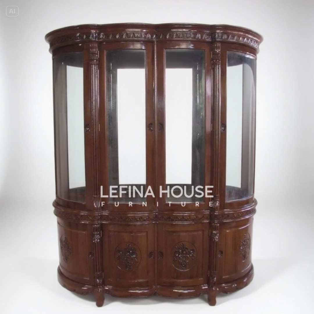 Lemari ini ideal untuk menyimpan dan memajang koleksi porselen, kristal, hingga buku antik atau cenderamata berharga. Ukurannya yang besar memberikan ruang penyimpanan maksimal tanpa mengorbankan estetika interior.