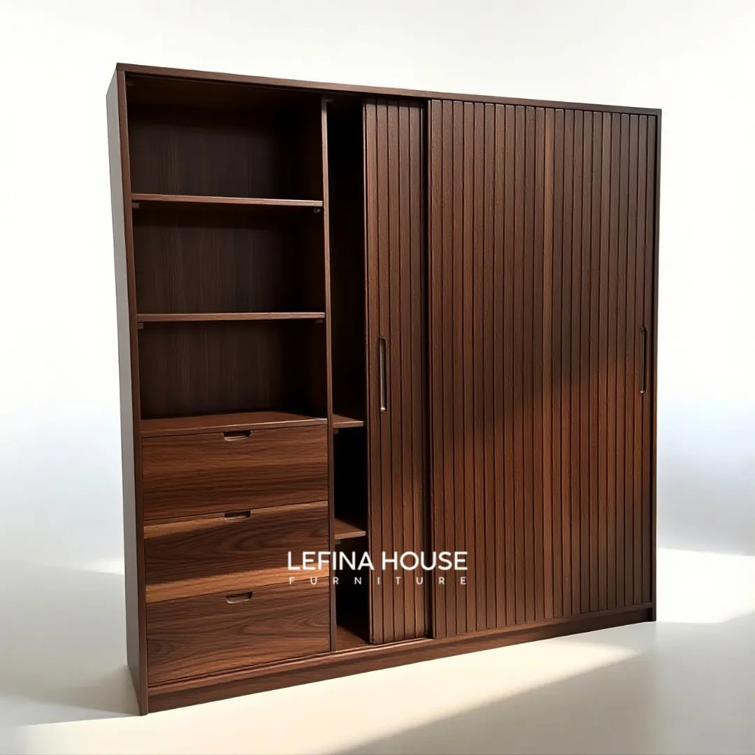 Mekanisme lemari pakaian sliding 2 pintu (geser) juga sangat menghemat ruang dan memberikan kemudahan akses, bahkan di ruangan dengan area terbatas. Sistem rel halus membuat pintu mudah dibuka dan ditutup tanpa suara bising.