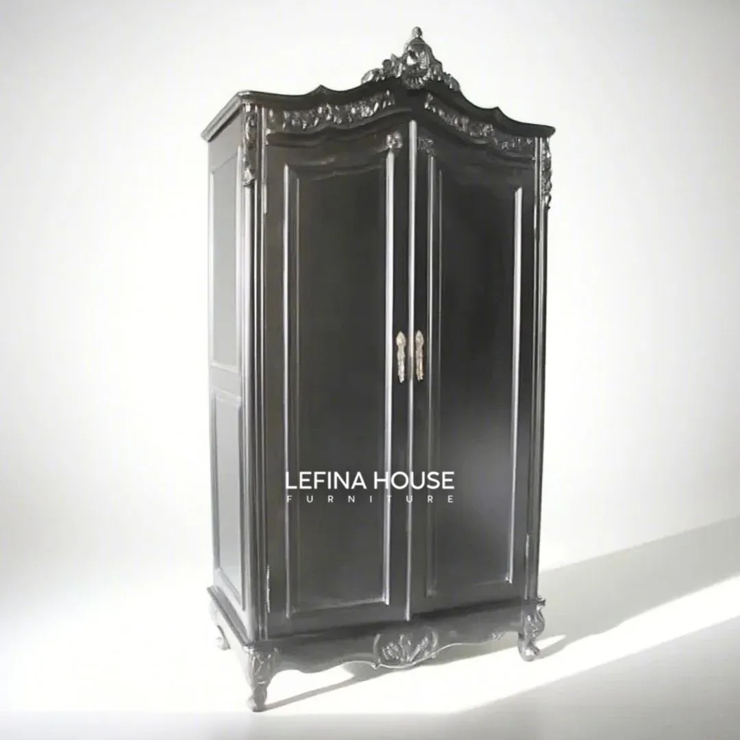 Cat duco glossy warna hitam memberikan efek visual mengkilap mewah yang tahan lama dan mudah dibersihkan. Warna ini cocok dipadukan dengan berbagai warna dinding interior, terutama warna netral dan emas. Glossy finish juga membuat lemari tampak modern meski desainnya klasik.