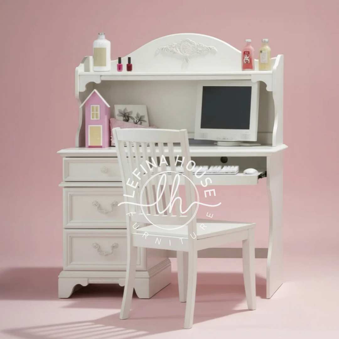 Produk ini mengusung model meja belajar dengan sentuhan klasik namun tetap terlihat fresh. Ciri khasnya terletak pada kombinasi warna Putih & Pink yang lembut. Finishing Cat Duco yang kami gunakan aman untuk anak-anak (non-toxic) dan mudah dibersihkan jika terkena noda tinta atau krayon.