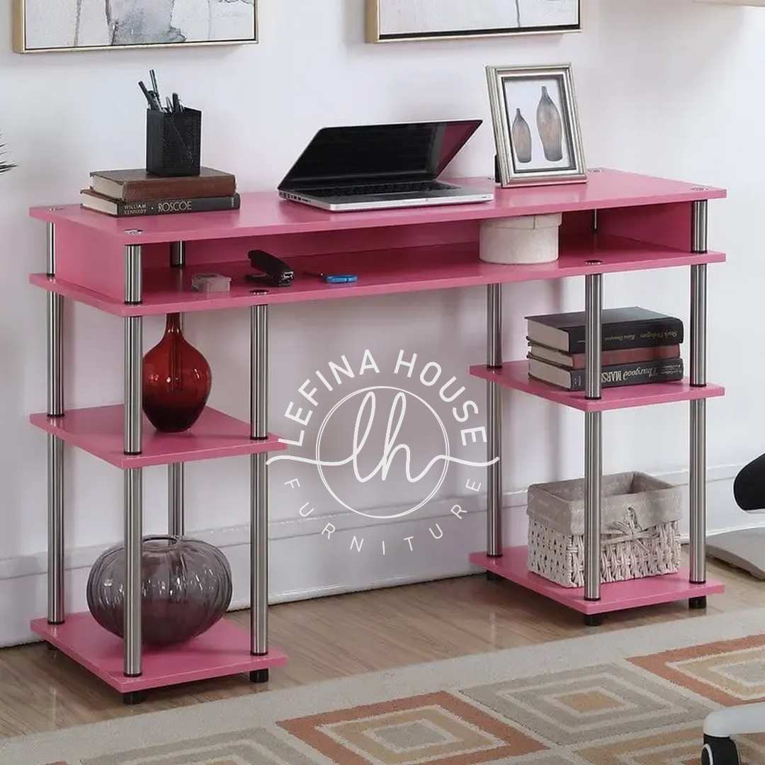 Memiliki meja yang bagus adalah langkah awal, namun penataan juga penting. Gunakan organizer tambahan di rak terbuka untuk mengelompokkan alat tulis kecil. Pastikan pencahayaan di area meja cukup terang. Dengan meja berwarna pink ini, Anda bisa memadukannya dengan kursi berwarna putih atau abu-abu muda untuk menciptakan kontras yang manis dan elegan.