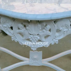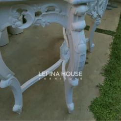 Meja konsul ini memiliki ukuran Panjang 100 cm x Lebar 38 cm x Tinggi 80 cm, cukup ramping untuk digunakan di area foyer, lorong, atau bahkan sebagai aksen dekoratif di ruang tamu klasik. Bentuk kaki melengkung, serta detail ukiran pada apron dan tepiannya memperkuat nuansa kemewahan yang timeless.