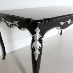 Ingin menghadirkan suasana jamuan makan malam yang megah layaknya di hotel bintang lima atau istana Eropa? Meja Makan Klasik Hitam Silver Mewah Ukiran Jepara adalah elemen kunci untuk mewujudkannya. Produk ini dirancang khusus untuk ruang makan bergaya formal, Victorian, atau Classic Luxury. Kombinasi warna hitam pekat dengan aksen perak (silver) menciptakan kontras yang dramatis dan sangat elegan.