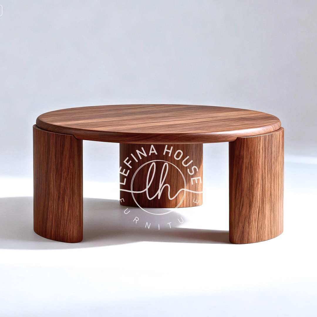 Kekuatan desain meja tamu kaki tiga ini terletak pada kesederhanaannya. Tiga kaki berbentuk silinder yang kokoh menopang permukaan meja bundar, menciptakan stabilitas yang luar biasa sekaligus tampilan visual yang ringan. Desain tiga kaki ini adalah ikon dari furnitur modern, memberikan keseimbangan yang sempurna antara massa dan ruang.
