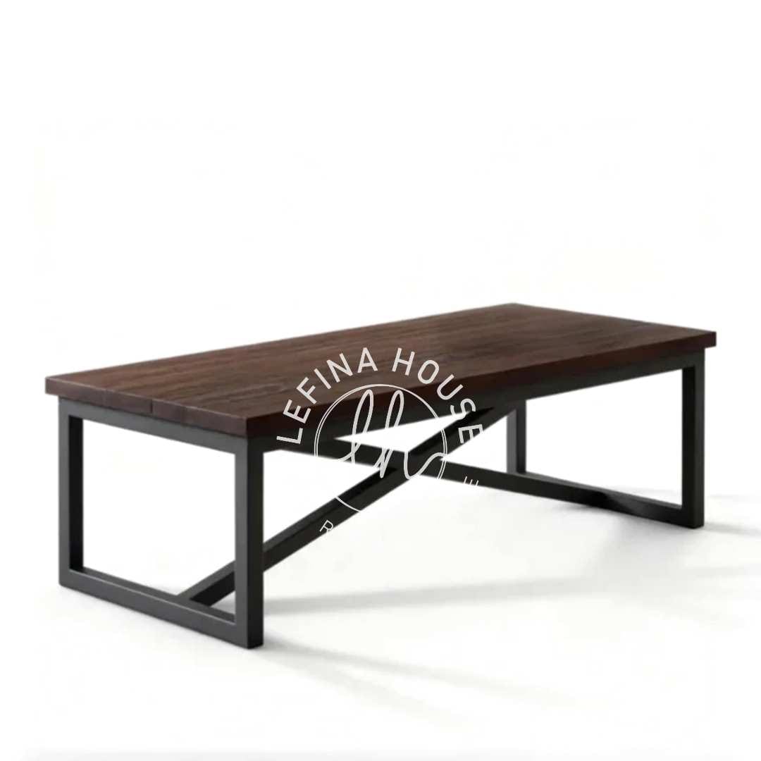 Gaya industrial tidak pernah lekang oleh waktu. Meja tamu minimalis kayu besi ini mengadopsi elemen-elemen kunci dari desain tersebut: ekspos material mentah (kayu dan besi) serta garis-garis yang bersih dan tegas. Rangka besi yang difinishing hitam doff memberikan kesan maskulin dan kuat, sementara permukaan meja dari kayu jati solid menambahkan sentuhan natural yang menyeimbangkan keseluruhan tampilan. Ini adalah pilihan ideal untuk menciptakan ruang tamu yang berkarakter.