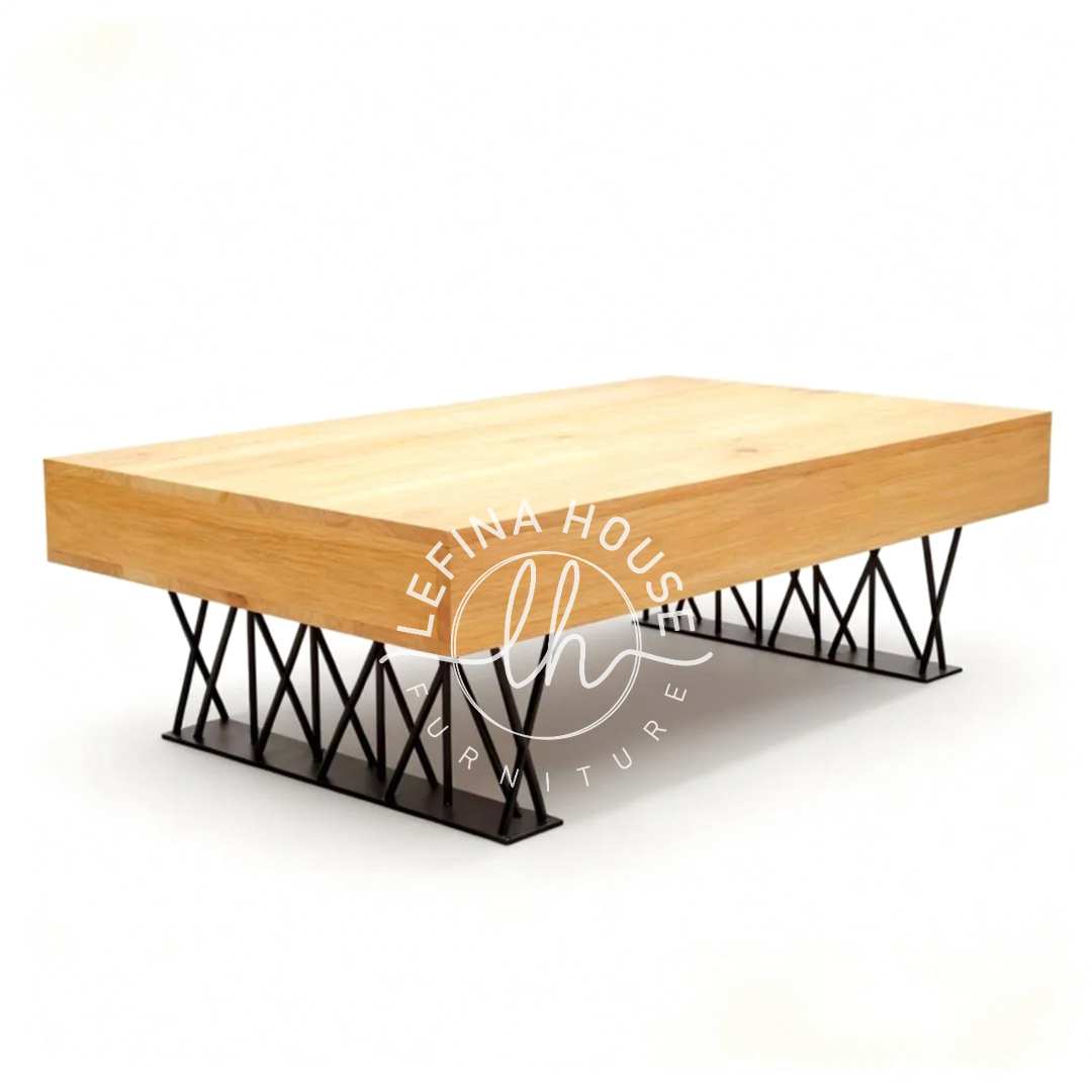 Kekuatan meja ini terletak pada materialnya. Top meja dari kayu solid menjamin permukaan yang awet dan otentik. Rangka kaki besi tidak hanya memberikan desain yang unik tetapi juga fondasi yang sangat kokoh dan anti goyang. Profilnya yang rendah (38cm) sangat cocok dengan tren sofa modern, menciptakan suasana lounge yang santai.
