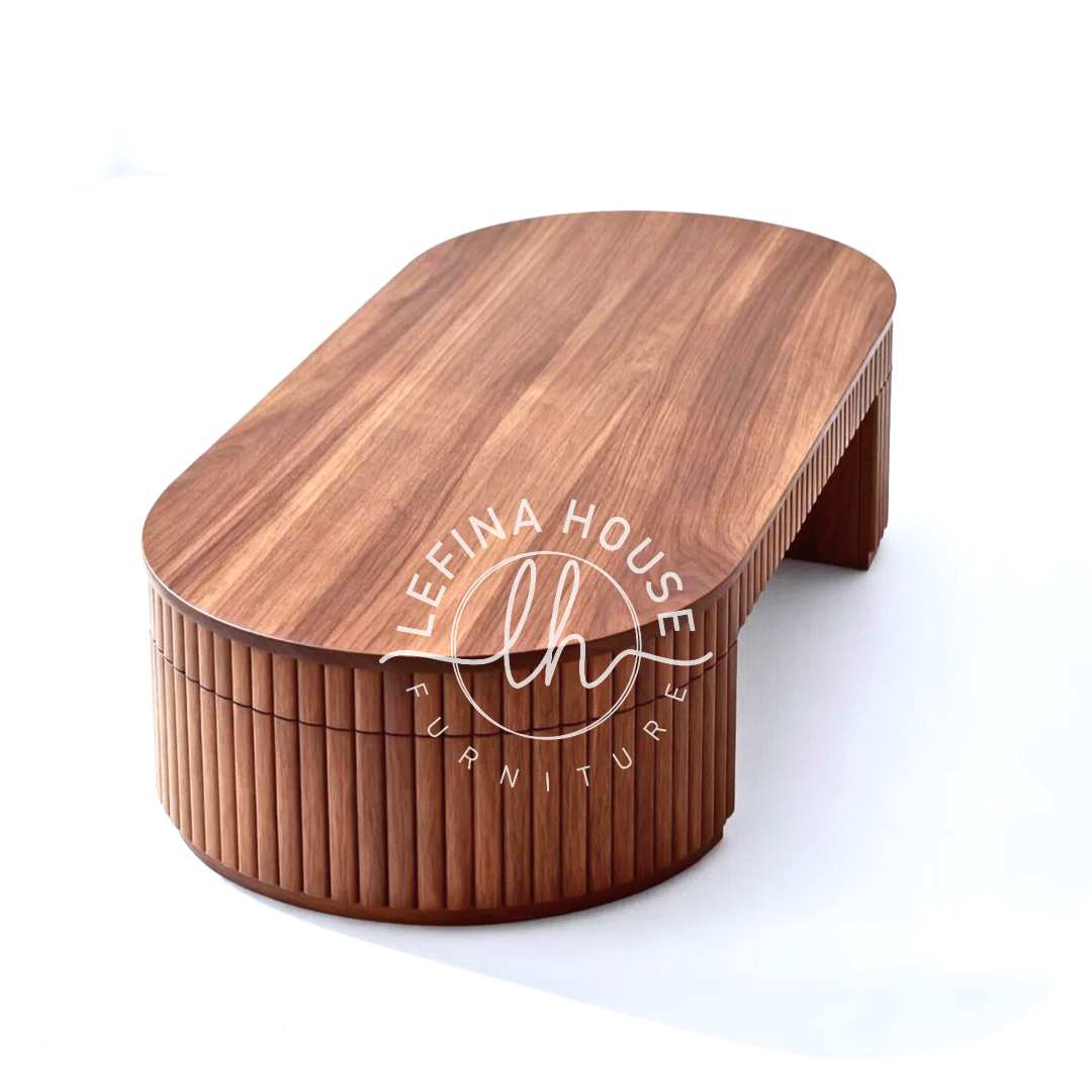 Daya tarik utama dari meja tamu oval ini adalah detail panel garis vertikal (fluted atau tambour) yang mengelilingi badan meja. Desain ini menciptakan permainan bayangan dan tekstur yang dinamis, menambahkan kedalaman visual yang tidak dimiliki meja minimalis biasa. Tren desain bertekstur ini, seperti yang diulas di berbagai majalah interior ternama, memberikan kesan hangat dan premium pada ruangan.