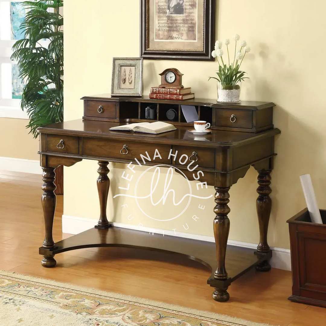 Meskipun bergaya antik, aspek kegunaan tetap kami perhatikan. Meja ini dilengkapi dengan rak kecil di bagian atas (top shelf) untuk meletakkan buku favorit atau lampu baca klasik. Anda dapat melihat inspirasi penataan meja gaya vintage di halaman kategori interior kami untuk ide dekorasi lebih lanjut.