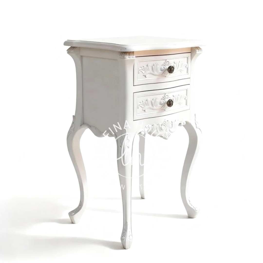 - Nama Produk: Nakas Putih Minimalis Classic 2 Laci Kaki Lengkung