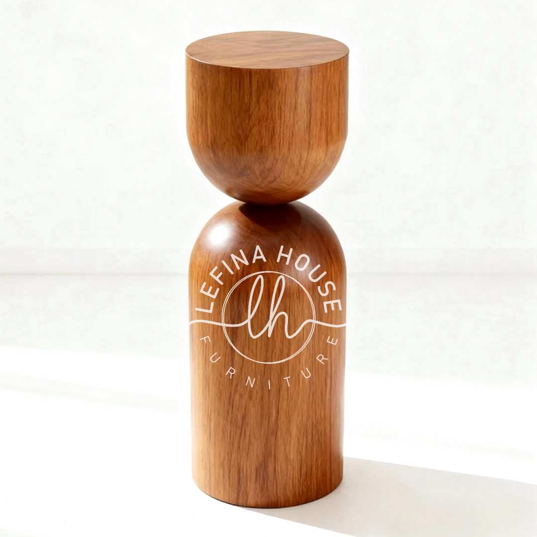 Bentuk silinder ganda pada nakas jati artistik ini menciptakan komposisi visual yang seimbang namun menarik. Desainnya yang bersih membuatnya cocok untuk berbagai interior modern.