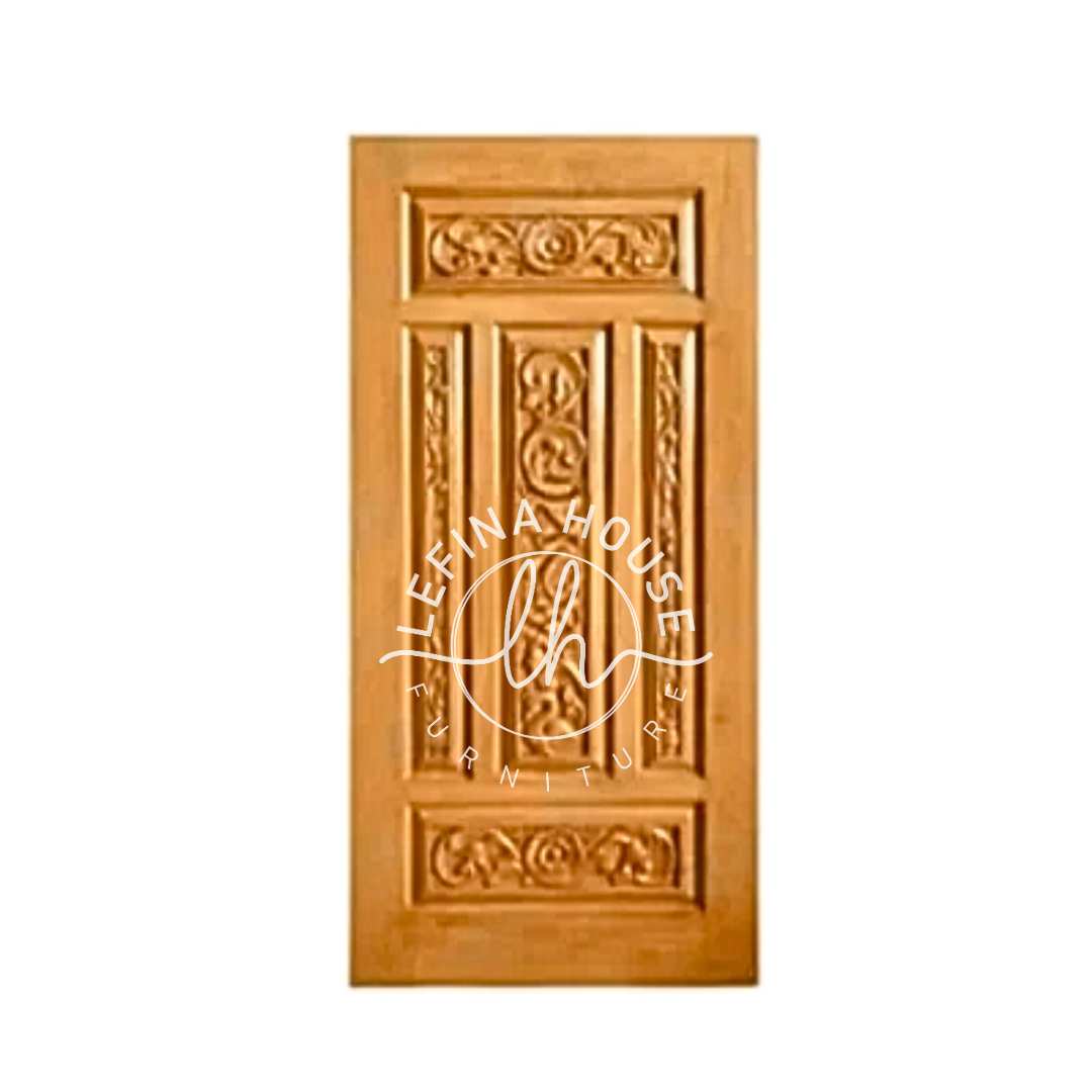 Lefina House, sebagai pengrajin mebel Jepara terpercaya, menggunakan bahan baku kayu jati TPK (Perhutani) grade A untuk memastikan pintu ini dapat diwariskan antar generasi. Kayu jati TPK dipilih karena densitas seratnya yang tinggi, memungkinkan pembuatan ornamen ukir yang dalam dan tajam tanpa risiko pecah. Proses Kiln Dry menjamin kestabilan dimensi pintu. Dibalut dengan finishing glossy, pintu ini memancarkan kilau emas kecoklatan yang mewah, siap menyambut tamu kehormatan di rumah Anda.