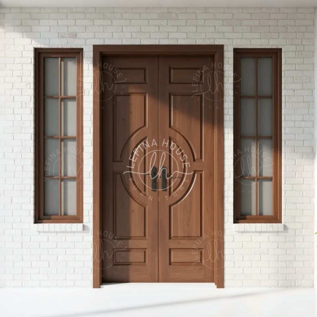 Pintu Kupu Tarung Jati Klasik menampilkan kombinasi panel simetris dengan ukiran bunga klasik di bagian tengah. Desainnya menghadirkan nuansa tradisional yang berkelas dengan material kayu jati pilihan.