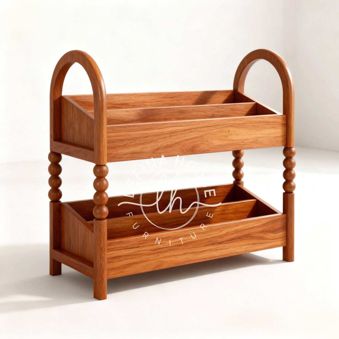 - Durabilitas Tinggi: Terbuat dari mebel jati solid, rak ini jauh lebih kuat dibandingkan rak plastik atau partikel board yang mudah patah.