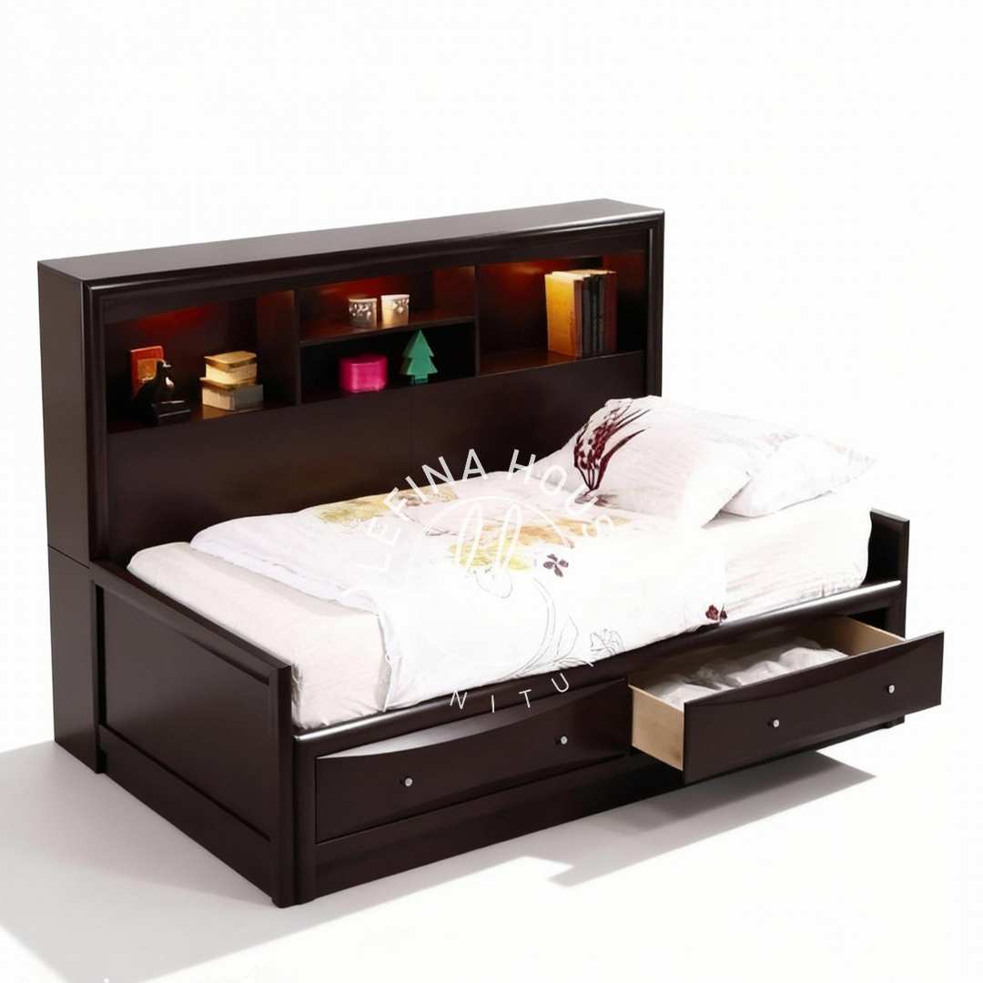 Organisasi Maksimal: Ranjang Kayu Gelap dengan Laci & Rak Buku