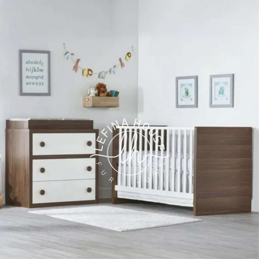 Sebagai produsen mebel Jepara yang inovatif, kami menciptakan paket mebel minimalis ini untuk menangkap esensi dari desain interior terkini. Perpaduan antara panel berwarna putih bersih dengan aksen laci dan kaki berwarna coklat kayu menciptakan kontras yang kaya, hangat, dan sangat menarik secara visual. Ini adalah fondasi yang sempurna untuk kamar bayi yang modern dan nyaman.