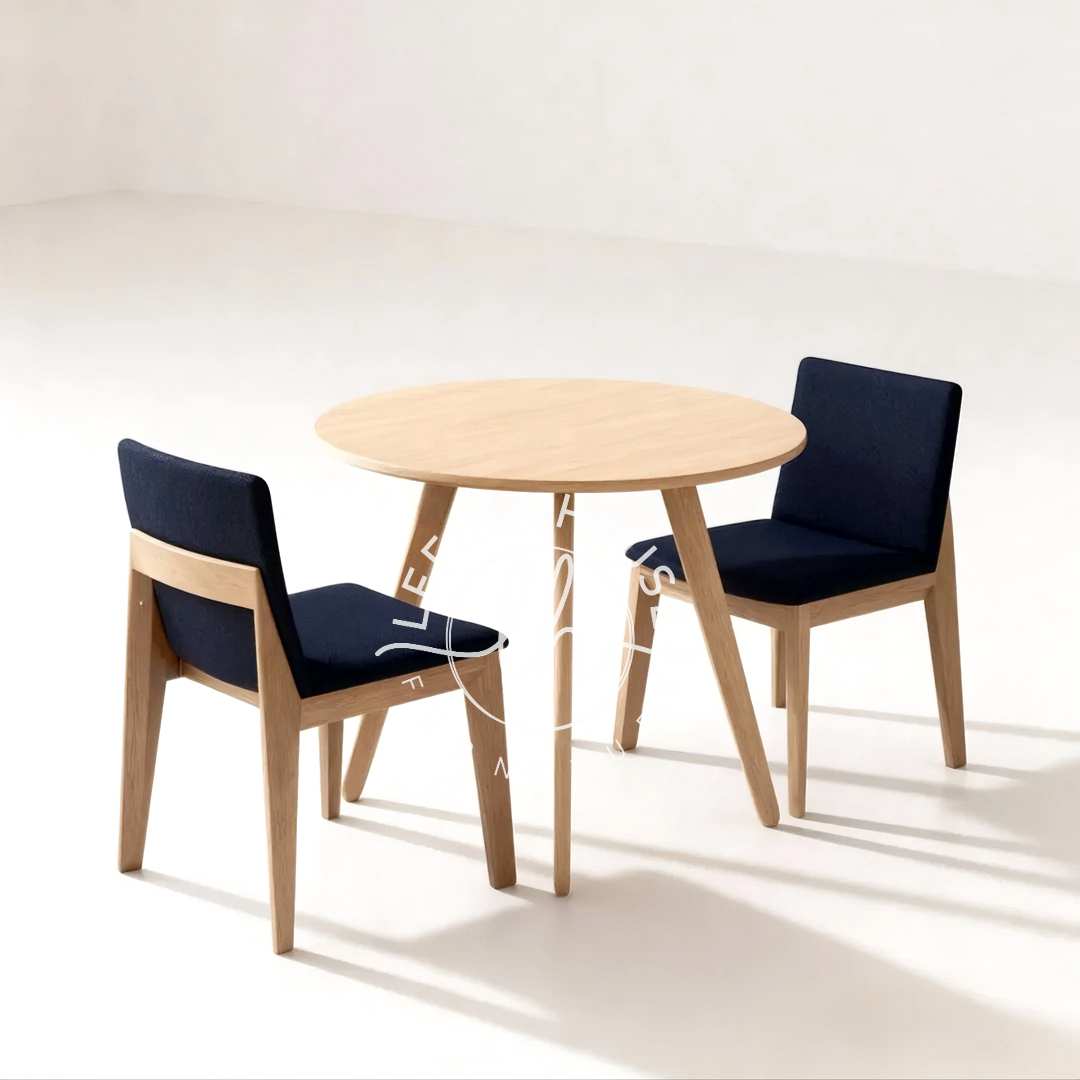 Dibuat dari material kayu jati solid berkualitas tinggi, set ini menjamin keawetan meski digunakan setiap hari. Meja berbentuk bundar (round table) lebih ramah ruang karena tidak memiliki sudut tajam yang menghalangi jalan, sementara kakinya yang ramping bergaya retro mid-century memberikan kesan visual yang ringan. Dipadukan dengan 2 kursi cafe bergaya vintage dengan jok warna biru navy (atau warna pilihan Anda), set ini tidak hanya fungsional sebagai meja makan bundar tetapi juga elemen dekoratif yang estetik ala mebel Jepara masa kini.