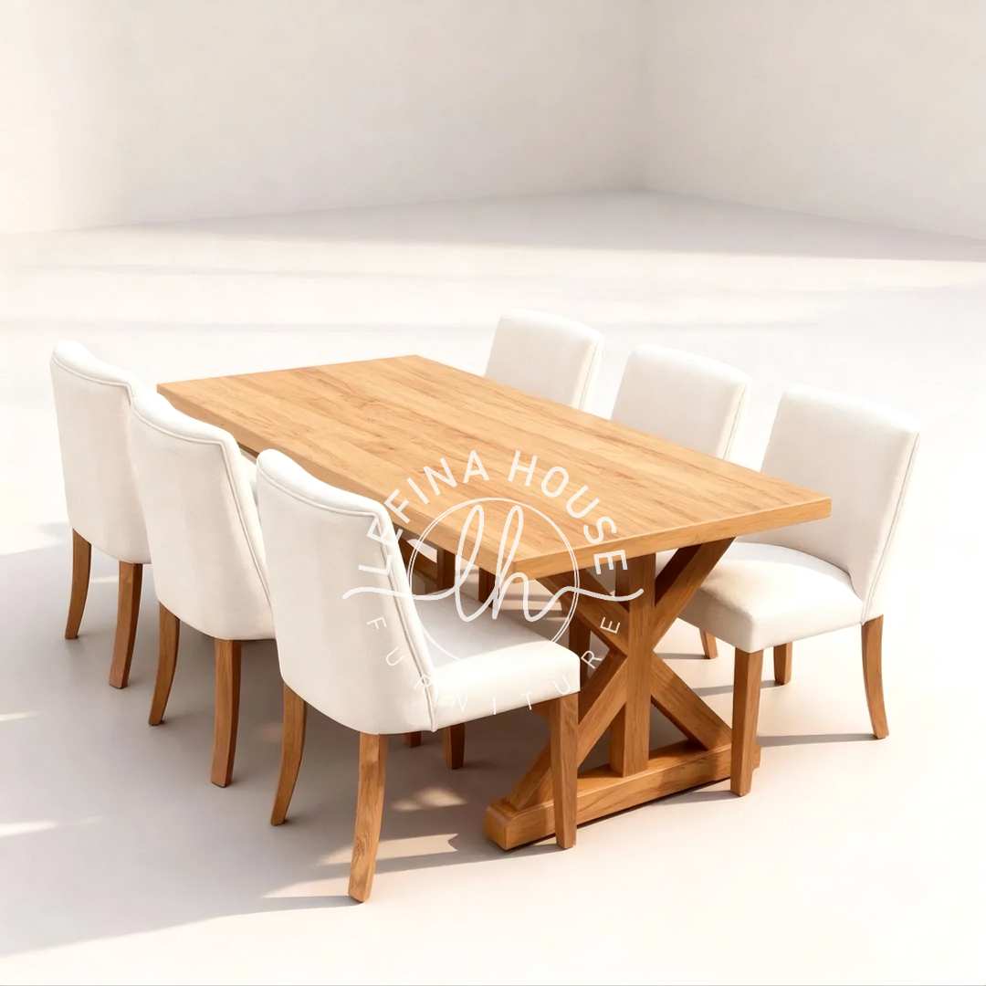 Hadirkan kehangatan gaya farmhouse yang homey namun tetap modern dengan Set Meja Makan Jati Kaki Silang 6 Kursi Jok Putih Modern. Gaya desain Modern Farmhouse kini semakin digemari di Indonesia karena mampu menciptakan suasana ruang makan yang akrab, santai, dan mengundang selera. Ciri khas utama dari set ini adalah desain kaki meja menyilang (X-base atau Cross Leg) yang ikonik, memberikan sentuhan artistik sekaligus konstruksi yang sangat stabil.