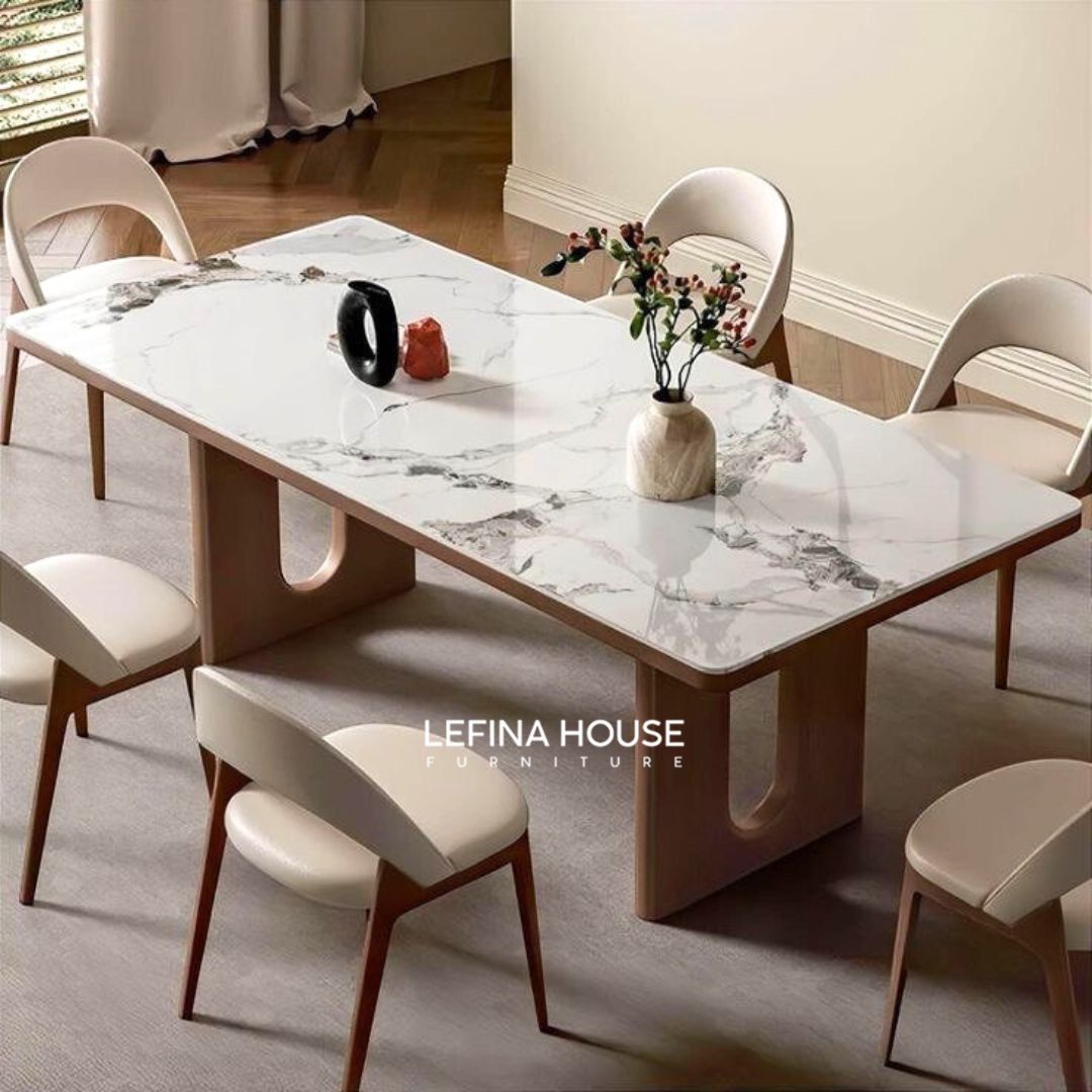 Setiap unit kursi dalam paket ini dirancang dengan gaya furniture minimalis yang ramping namun kuat. Sandaran kursi yang melengkung estetik tidak hanya mempercantik tampilan tetapi juga menopang punggung dengan nyaman. Sebagai toko furniture yang berorientasi pada kepuasan pelanggan, Lefina House memastikan setiap detail, mulai dari pemilihan urat marmer hingga finishing kaki kayu, dikerjakan dengan standar kontrol kualitas yang ketat. Produk ini sangat cocok disandingkan dengan lemari hias atau rak minimalis di ruang makan Anda.