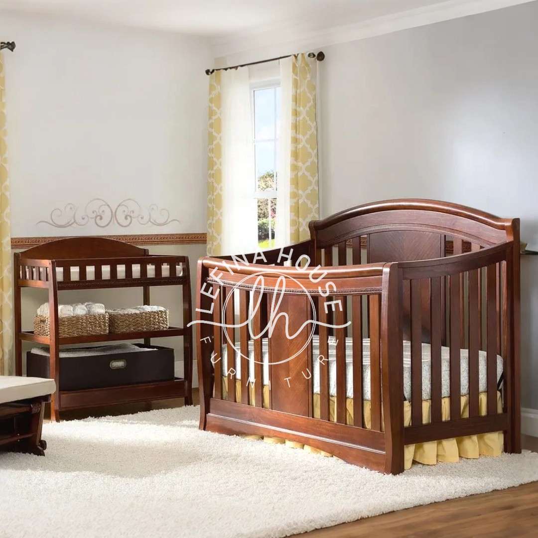 Pusat dari set ini adalah ranjang bayi sleigh dengan ciri khas headboard dan footboard yang melengkung anggun ke luar, menyerupai kereta luncur salju. Desain ini adalah simbol dari kemewahan klasik yang akan menjadi focal point yang menawan di dalam kamar.