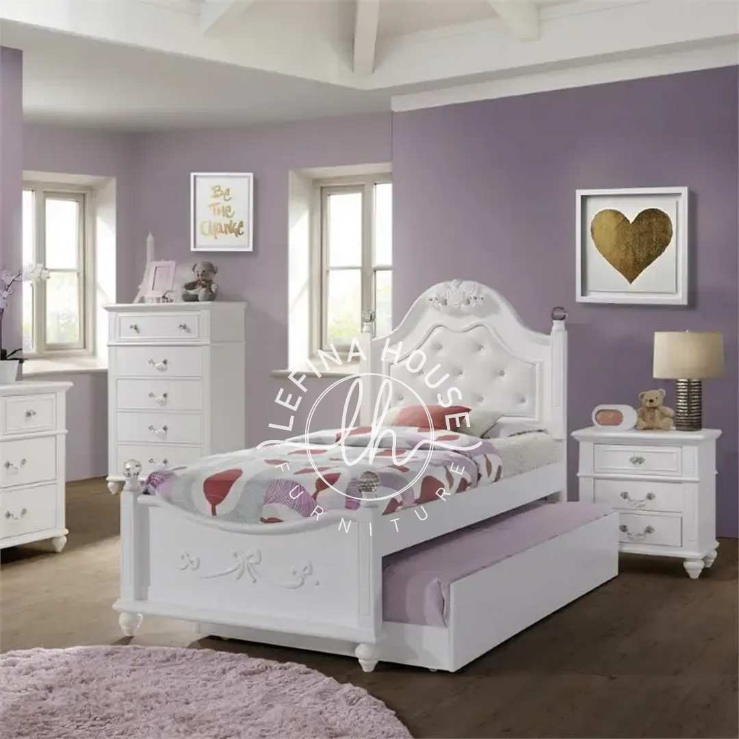 Set tempat tidur anak sorong modern ini menawarkan solusi ruang tidur yang efisien dan elegan. Didesain dengan gaya modern glamor, produk ini menjadi pilihan ideal bagi orang tua yang menginginkan tampilan kamar anak yang rapi, bersih, dan stylish. Terbuat dari material mahoni berkualitas, finishing cat duco putih yang halus memberikan kesan mewah pada interior kamar.