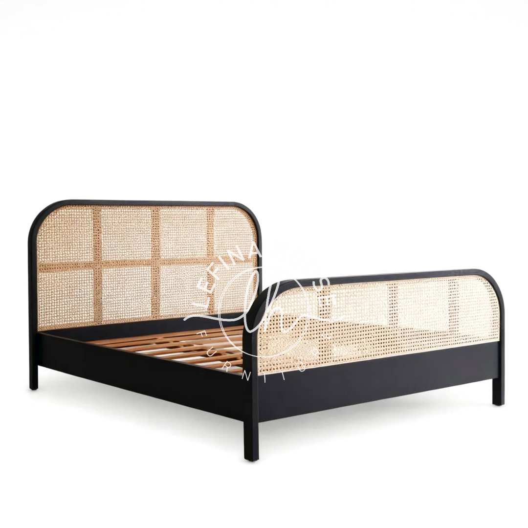 Untuk melembutkan ketegasan rangka besi, bagian sandaran kepala (headboard) diisi dengan panel anyaman rotan alami. Meskipun rotan juga difinishing hitam, tekstur anyamannya tetap terlihat, memberikan dimensi visual dan sentuhan organik. Ini adalah detail yang membuat ranjang minimalis ini tampil beda dan tidak monoton.