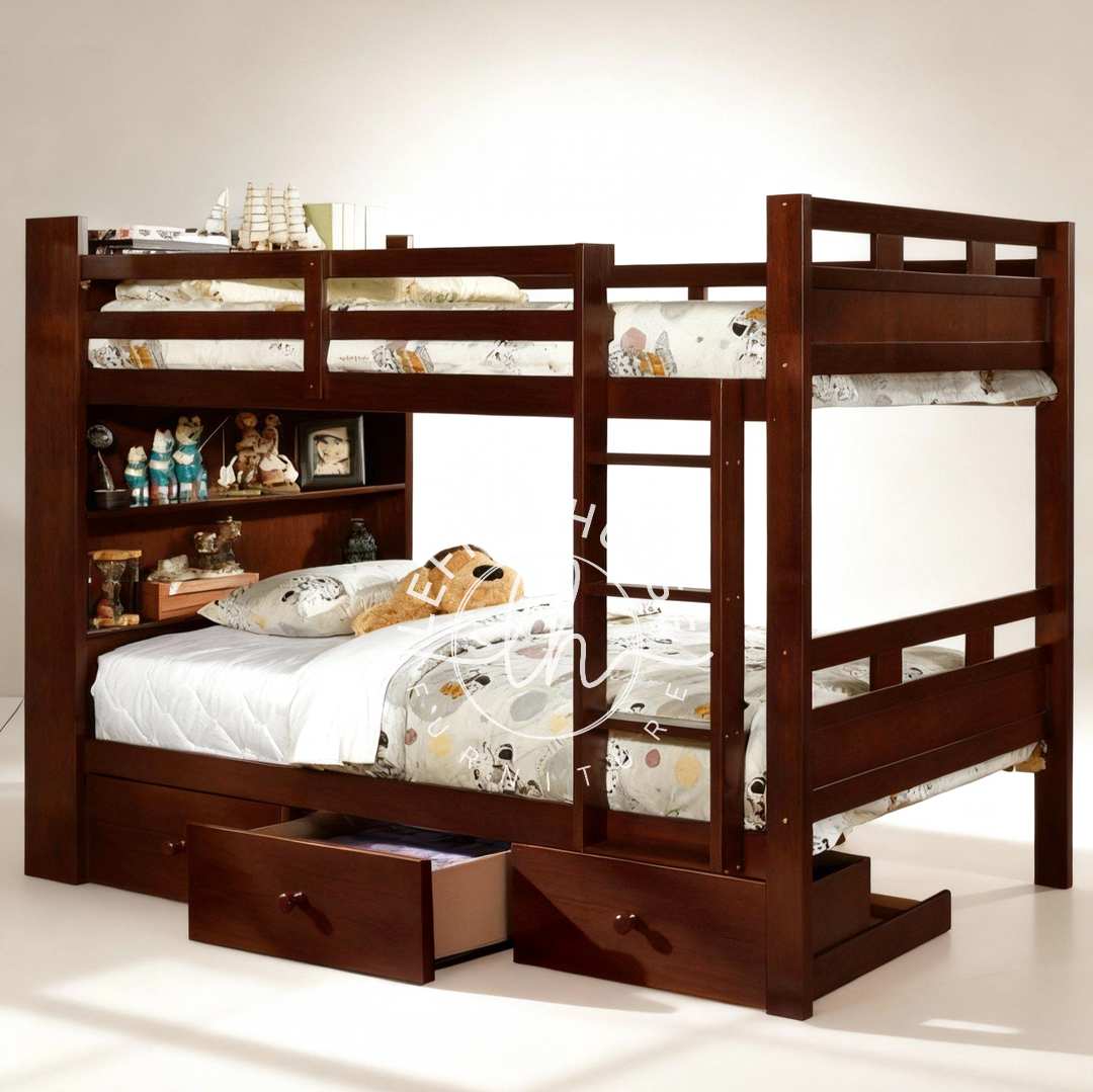 Hadirkan solusi tidur cerdas dan rapi di kamar anak dengan Tempat Tidur Tingkat Jati Rak Kepala. Ini bukan sekadar tempat tidur tingkat biasa; ini adalah unit penyimpanan terpadu yang dirancang untuk si ‘kutu buku’. Dibuat dari 100% furniture jati solid, produk ini menggabungkan dua fitur fungsional utama: rak buku yang terintegrasi di headboard (sandaran kepala) dan dua laci penyimpanan besar di bagian bawah.