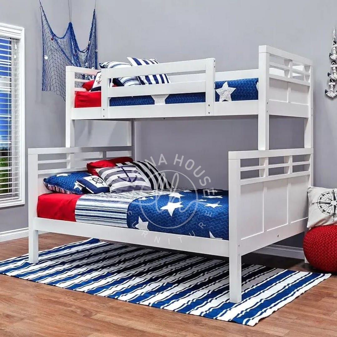 Desain modern minimalis dengan kombinasi warna putih dan biru lembut. Pagar pengaman tinggi untuk keamanan anak saat tidur di tingkat atas. Material kayu mahoni solid yang kuat dan tahan lama. Finishing cat duco halus, tahan gores, dan ramah lingkungan. Konstruksi stabil dengan sambungan presisi khas mebel Jepara.